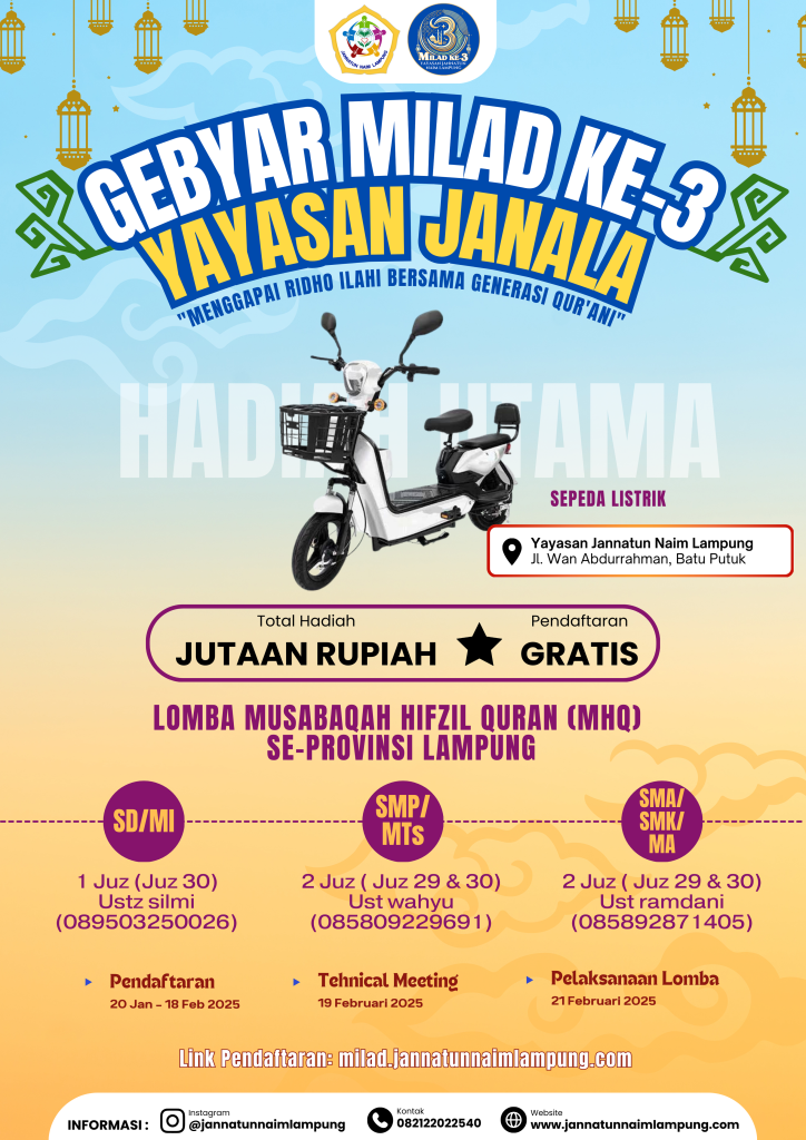 GEBYAR MILAD KE-3 YAYASAN JANNATUN NAIM LAMPUNG Assalamualaikum, halo jangan lupa ikuti LOMBA MUSABAQAH HIFZIL QURAN (MHQ) Se-provinsi Lampung. Mendaftar 4.8/5 082122022540 Hadiah Utama Sepeda Listrik. Youtube Janala Channel More Information Silahkan unduh Juklak dan Juknis di bawah ini! PDF JUKLAK DAN JUKNIS